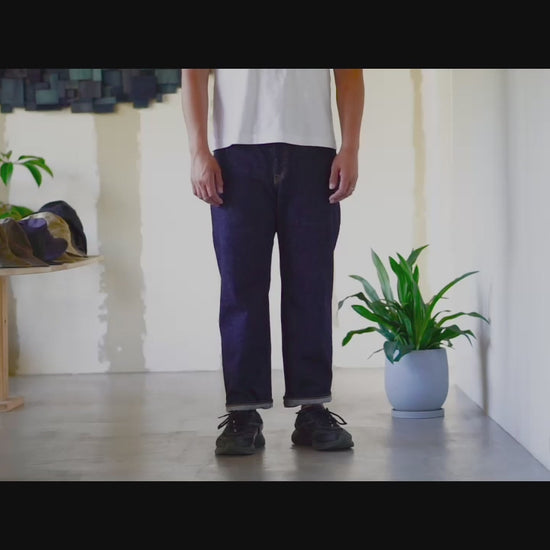 Made using 100% pure indigo and traditional rope dyeing techniques. Although the surface of the thread is dyed blue, the core of the thread is not dyed. This "white core" contrast creates a beautiful aging effect as the garment is worn. It was created around 1990 and uses extra dark colors that create strong contrast fades.